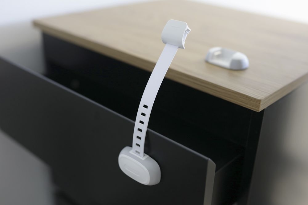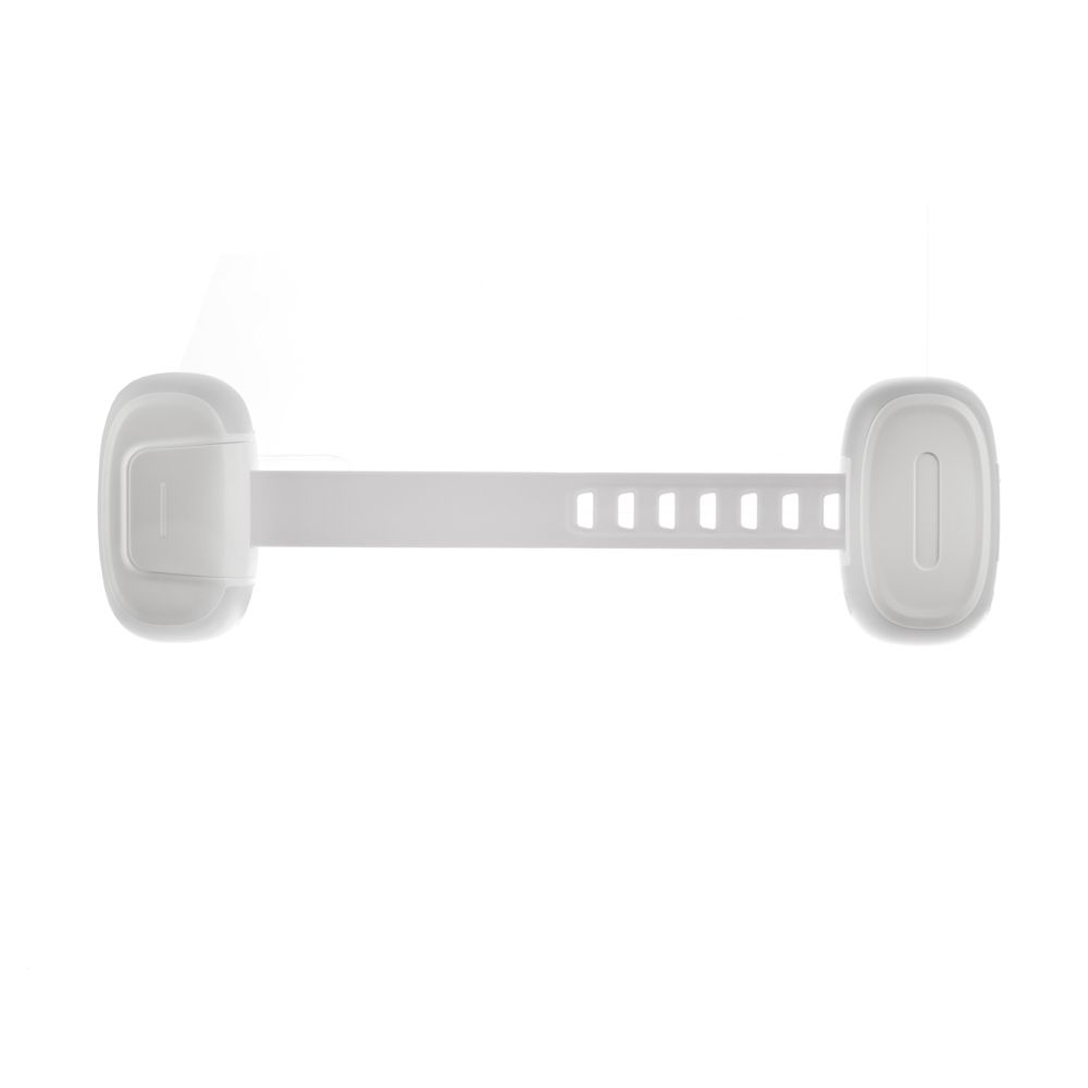 Zabraňuje otevření zásuvek i skříněk. Délku lze upravit podle potřeby. Pro otevření zámku slouží tlačítko, které děti nedokáží stisknout.