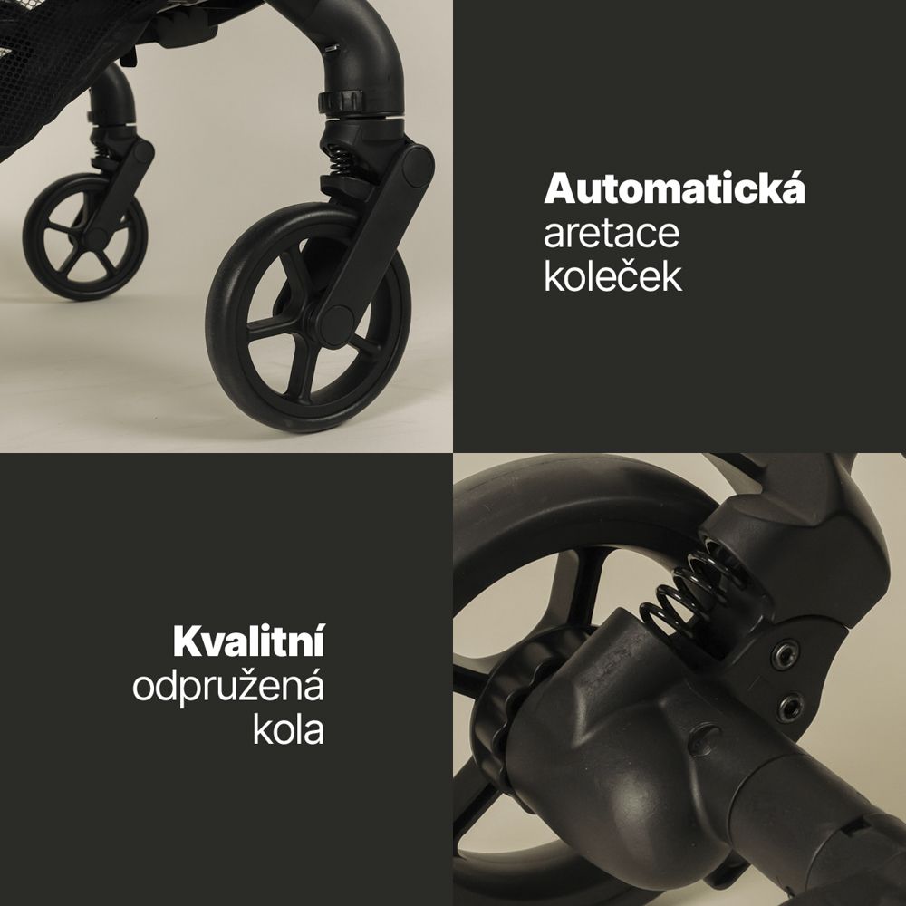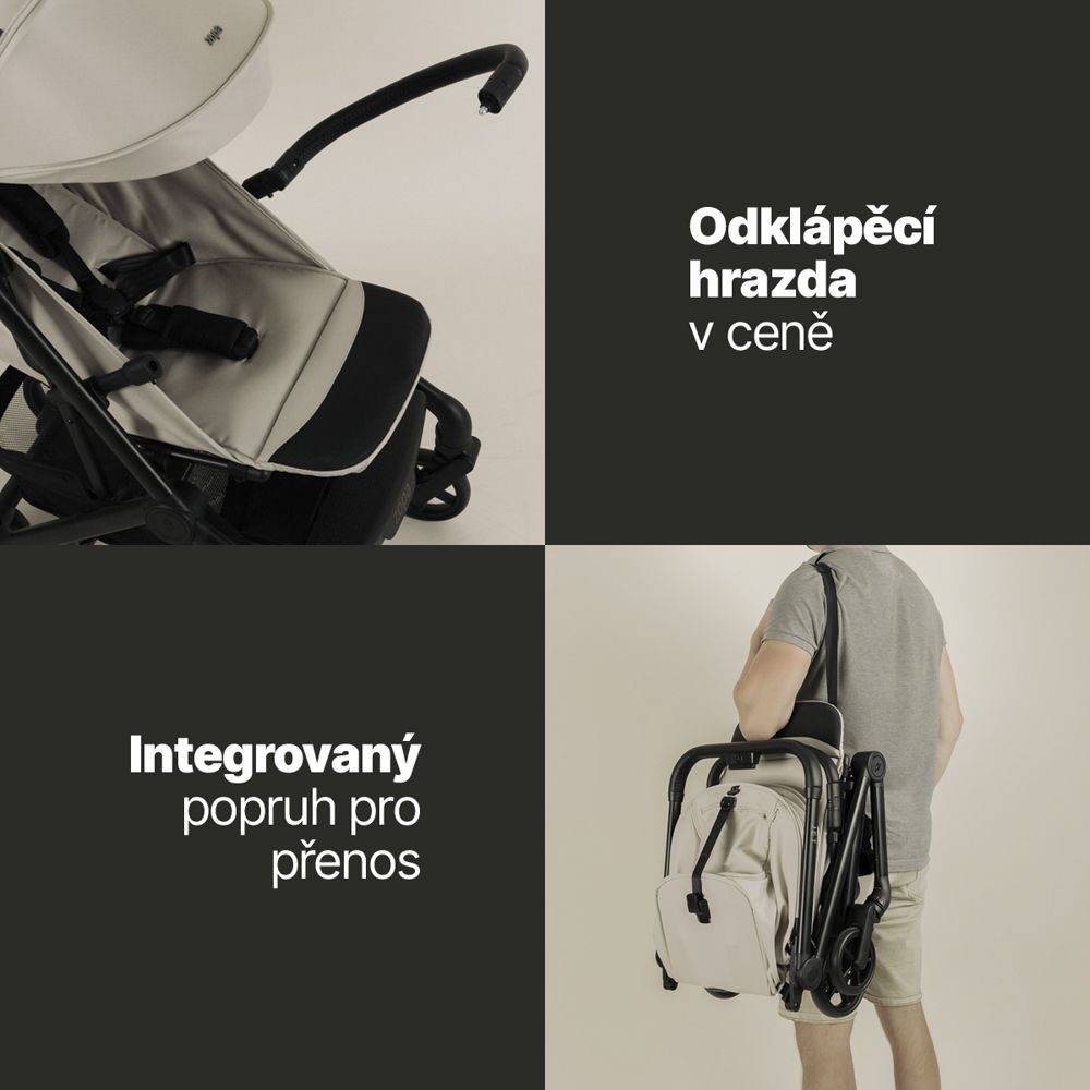 • Kompaktní rozměry, skládání během vteřiny a pohodlí jako v klasickém kočárku.
