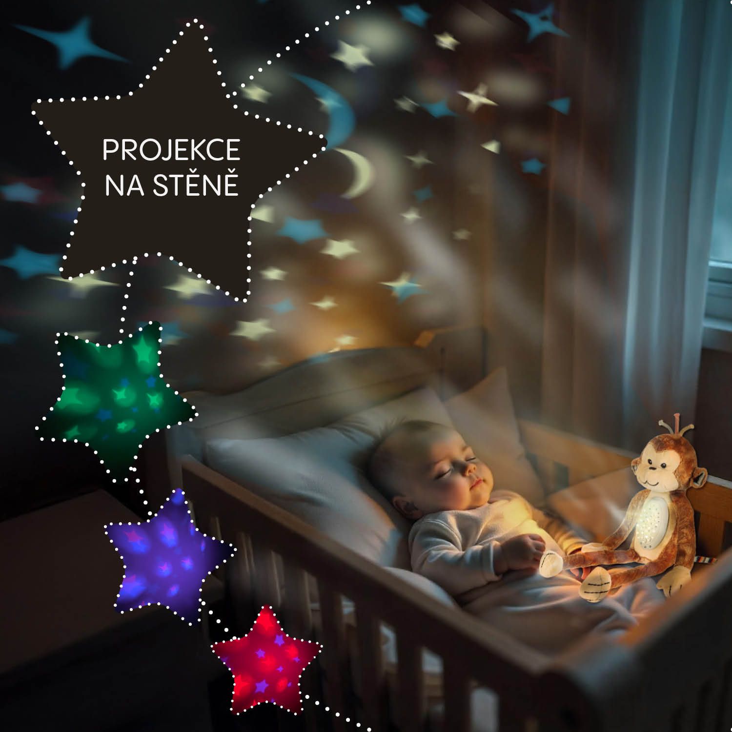 Stačí jedno stisknutí a pokoj zaplní jemné světlo, barevné projekce a uklidňující tóny.