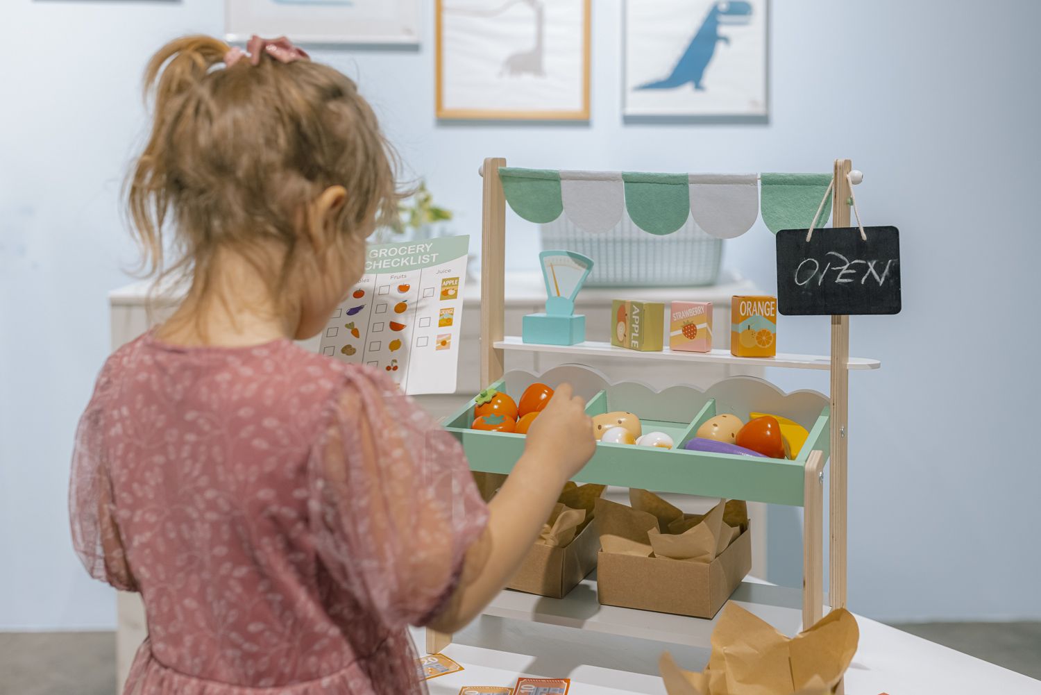 Kdy dostanu zboží? Velká dřevná hračka, podpora představivosti, procvičování sociální interakce, zábavná hra na obchod, papírové peníze, nákupní seznam, kartonové bedýnky, váha na zvážení.