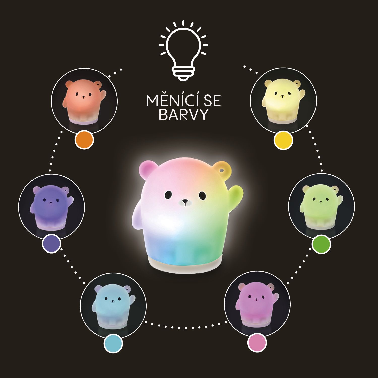 Silikonové světýlko je vybaveno stmívatelným bílým světlem, které snadno přizpůsobíte aktuálním potřebám. Pro hravější atmosféru si vaše dítě může vychutnat plynulý přechod mezi barvami nebo zastavit světýlko na jeho oblíbené barvě. Díky světýlku se bude děťátko cítit bezpečně.