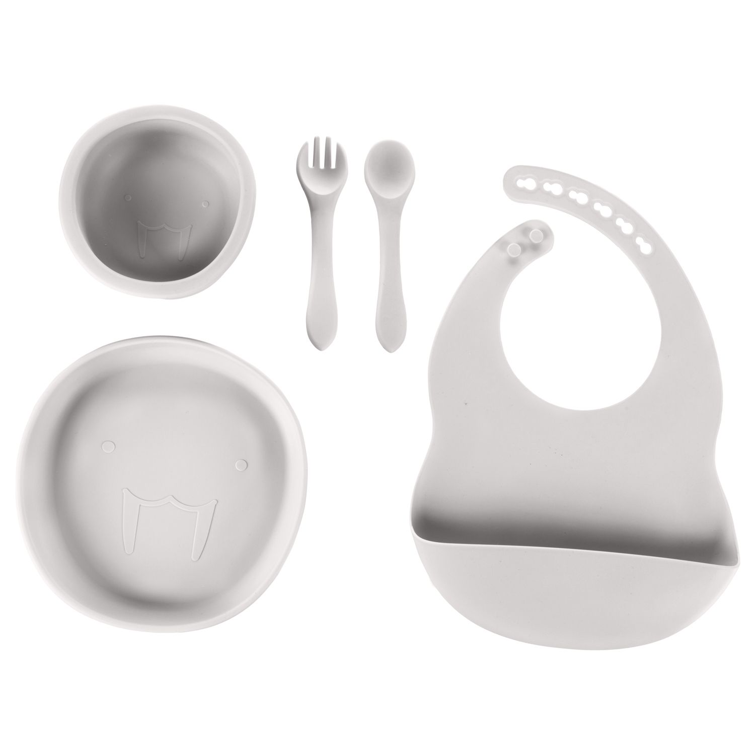 • Sada nádobí z potravinářského silikonu obsahuje misku se zvýšenými okraji a přísavkou, dělený talířek s přísavkou, nastavitelný bryndák a lžičku.