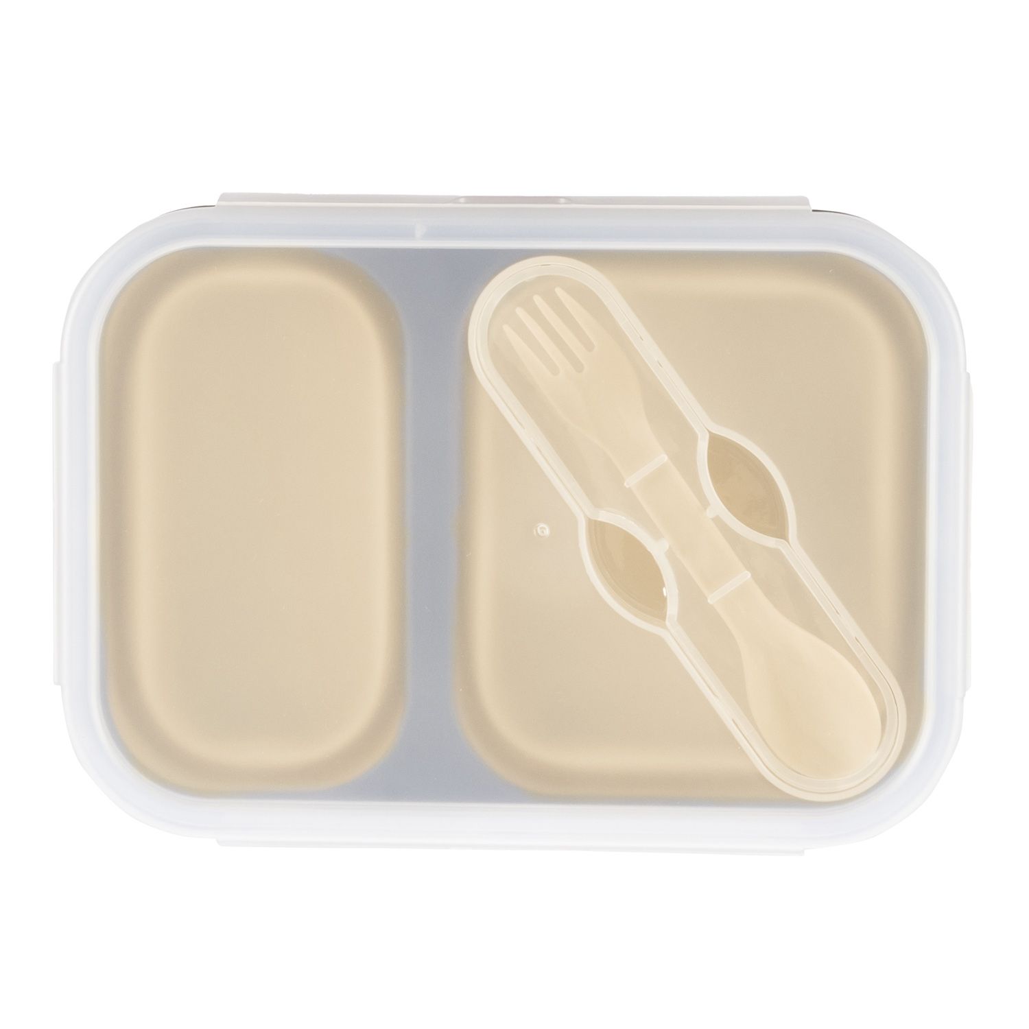 Potravinářský silikon, skládací, 2 samostatné oddíly, dobře těsnící víčko, vhodný do mikrovlnné trouby, vestavěná přihrádka pro příbor, příbor součástí