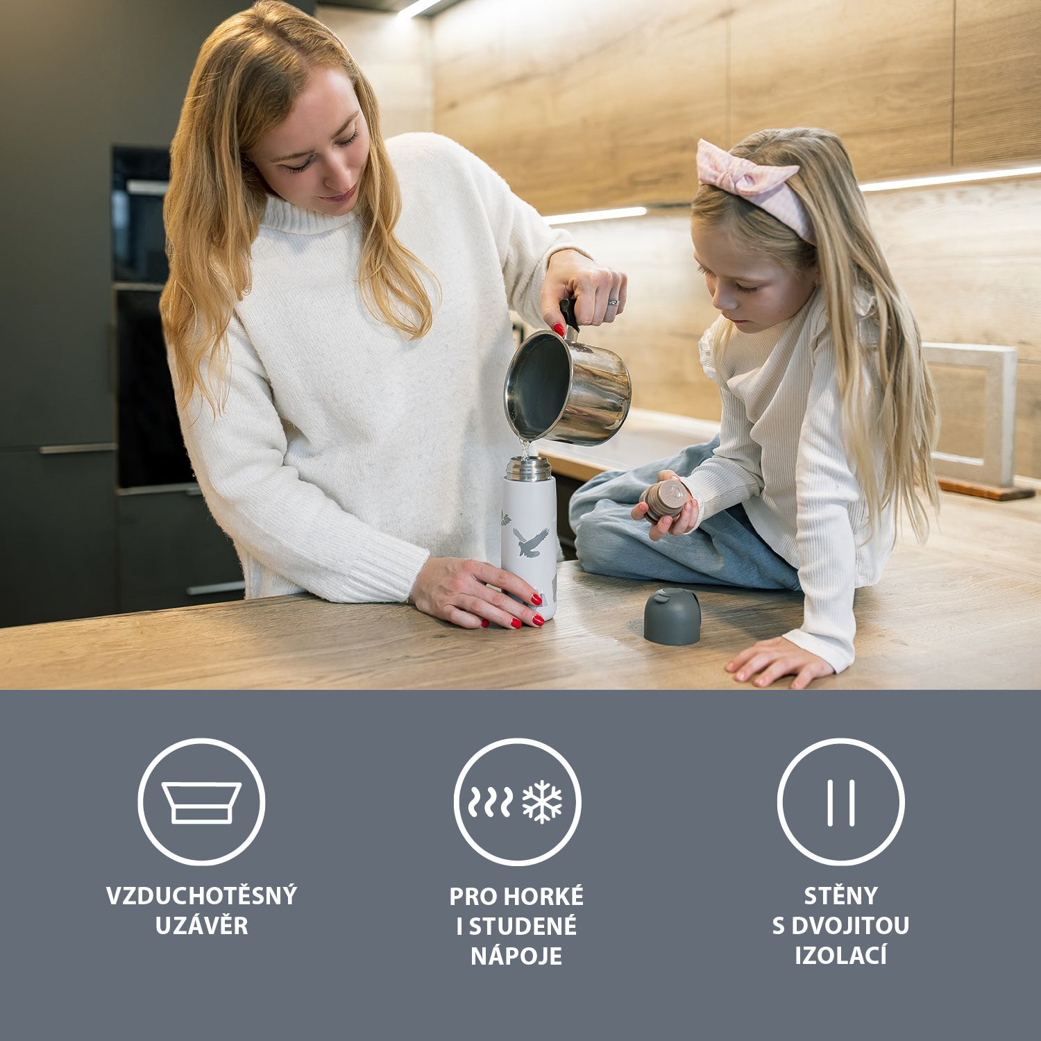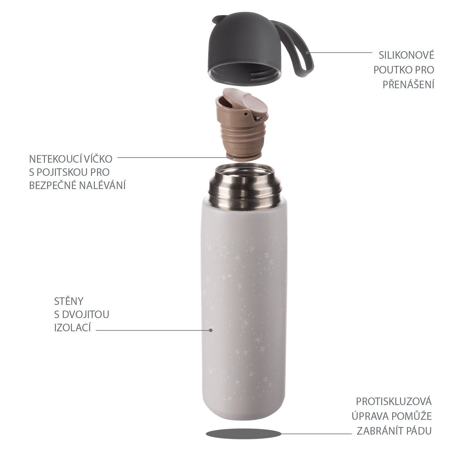 • Těsné víčko zajišťuje, že termoska neprotéká a vrchní uzávěr pro pohodlné nalévání se postará o to, abyste se nepolili ani při jízdě autem na nerovné cestě, taktéž si můžete být jisti, že se dítě neopaří tekutinou z termosky vzhledem ke dvojitému uzávěru.