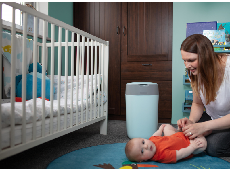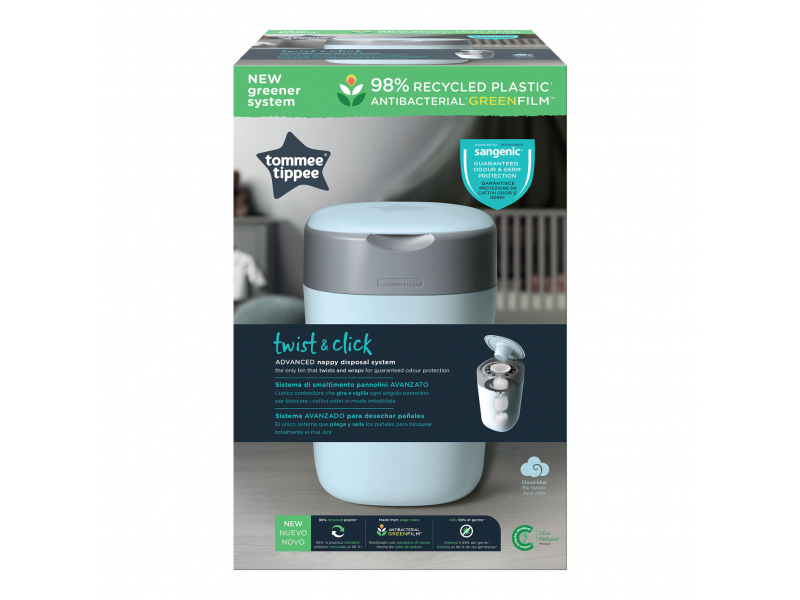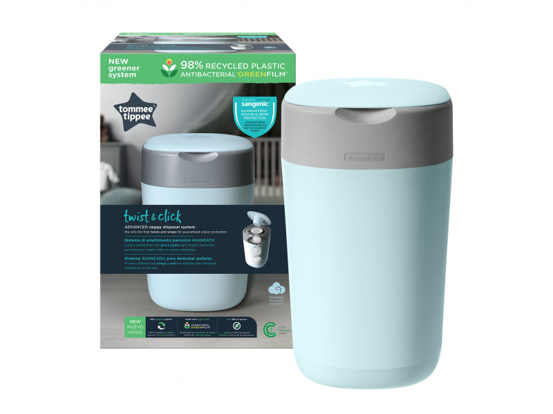 Nový, ekologičtější designový koš na jednorázové pleny Sangenic Twist & Click umožňuje bez­dotykové zabalení použi­tých plen.