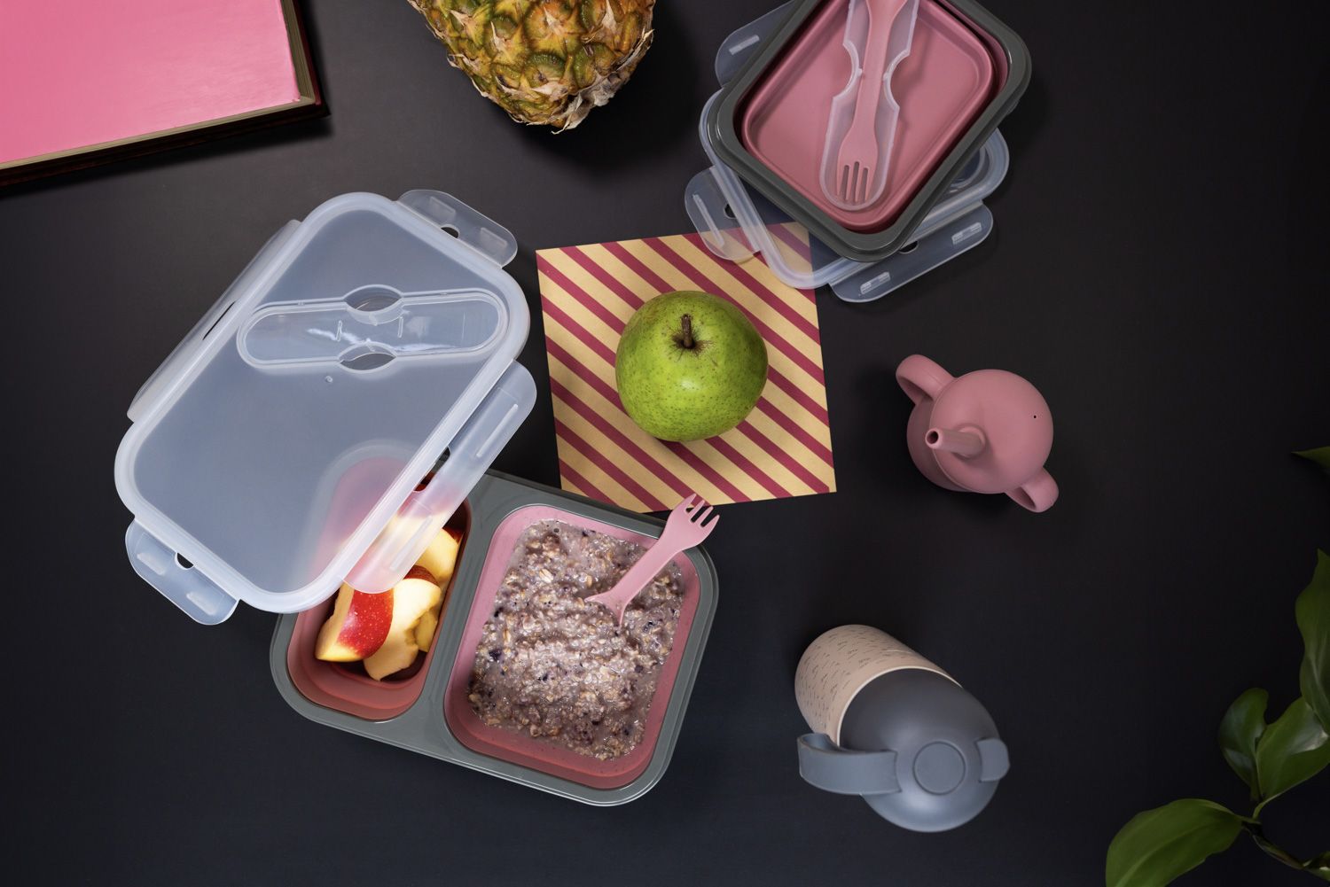 Potravinářský silikon, skládací, 2 samostatné oddíly, dobře těsnící víčko, vhodný do mikrovlnné trouby, vestavěná přihrádka pro příbor, příbor součástí