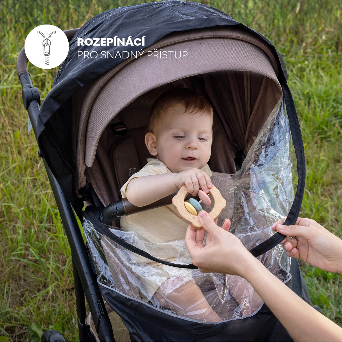 Praktické zipové okénko umožňuje rychlý přístup k dítěti bez nutnosti sundání celé pláštěnky.