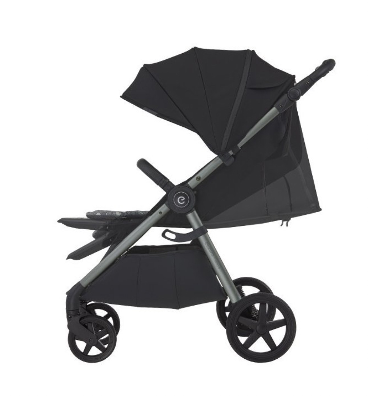 - Při poloze v leže je kočárek bezpečný díky bezpečnostní síti – zabraňuje vyklouznutí dítěte
