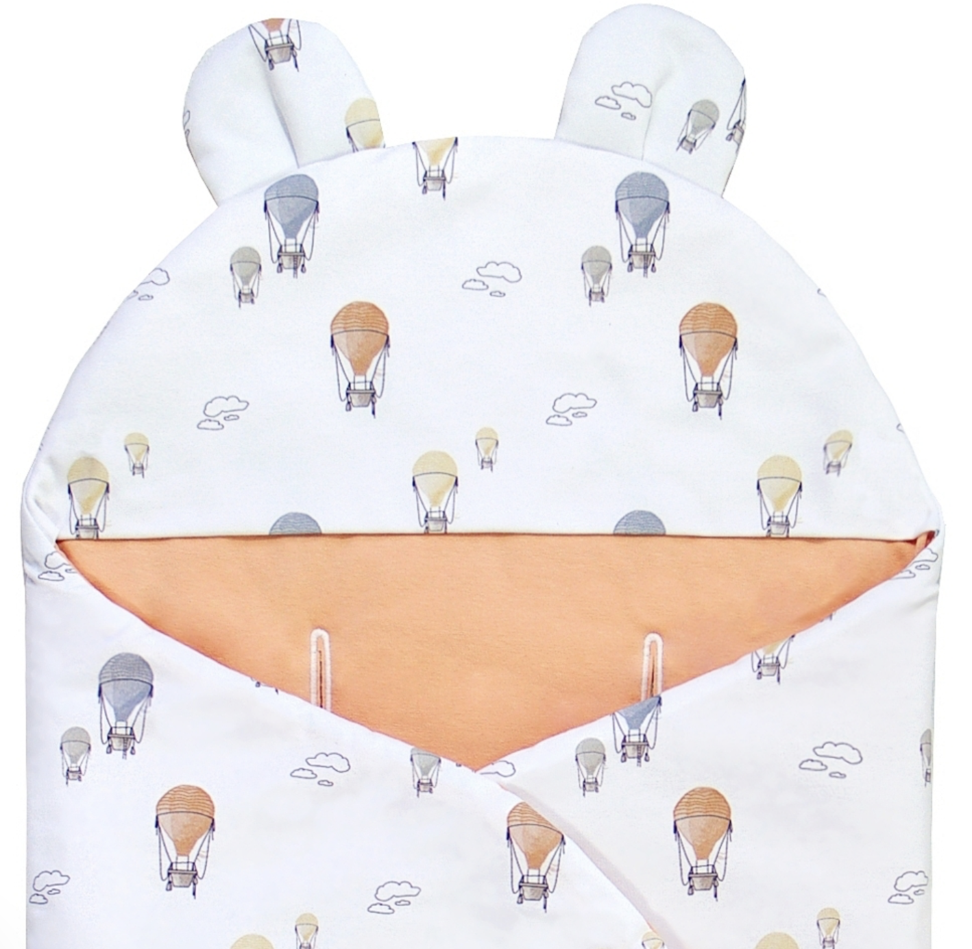 • Designovým prvkem jsou roztomilá ouška, která dodají zavinovačce na atraktivnosti, a kapuce.
